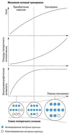 В исследовании Moritani и de Vries (1979) была изучена взаимосвязь между иннервацией моторных единиц и размером площади поперечного сечения мышцы. В течение 12-недельной силовой тренировки мышц-сгибателей локтя только на одной руке наблюдались повышенная электромиографическая активность, повышение силы и увеличение площади поперечного сечения мышц. Во второй руке были замечены только проявления нервно-мышечной адаптации в виде повышения электромиографической активности и увеличения силы. Во второй половине данной фазы тренировки наблюдалось снижение электромиографической активности, что было вызвано увеличением площади поперечного сечения мышцы тренированной руки вследствие гипертрофии. Объясняется это гем, что отдельные моторные единицы при увеличении площади их поперечного сечения могут развивать больше силы, так что для поддержания постоянной силы достаточно активации их небольшого количества. На нетренированной руке снижения электромиографической активности по причине отсутствия увеличения площади поперечного сечения мышц не наблюдалось. Гипертрофия мышцы и нацеленная на нее тренировка повышают, таким образом, только возможный силовой потенциал мышцы. Для того чтобы его полностью реализовать, дополнительно назначается тренировка на улучшение внутримышечной координации. Для тренировки силового показателя значительную роль играет последовательность процессов адаптации (меж- и внутримышечная оптимизация предшествуют увеличению площади поперечного сечения мышц), поскольку рост силы может проходить без одновременного увеличения массы в виде «утолщения» мышцы. При этом улучшается показатель относительной силы (Letzelter, 1978) и снижается потребность мышц в дополнительных питательных веществах. Что касается относительной силы, данный аспект может играть большую роль в случае необходимости увеличить скорость движения собственного тела. Снижение потребности мышц в дополнительных питательных веществах может быть причиной того, что организм сначала оптимизирует процессы, происходящие в мышцах, и их взаимодействие и только после этого начинает искать неблагоприятное с энергетической точки зрения решение и увеличивать мышечную массу. В современных исследованиях ставится вопрос о том, насколько уже улучшенная нейронная активизация может вызывать гипертрофию. Такую точку зрения проясняют исследования возрастной атрофии, которые показывают, что причиной потери мышечной массы является ослабление нейромышечной активации (Saini et al., 2009; Narici, Maganaris, 2006; Boonyarom, Inui, 2006). Отсюда следует, что тренировка внутримышечной активности должна учитывать определенные требования: если в наиболее короткие сроки необходимо добиться синхронной произвольной активизации наибольшего количества моторных единиц, тренировка должна включать соответствующие раздражители — как правило, в диапазоне от субмаксимальных до максимальных раздражителей в пределах минимально короткого промежутка времени.