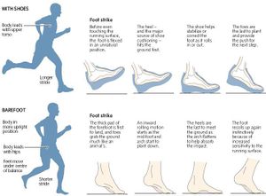 Структура человеческой стопы и голени очень эффективно поглощает удар от контакта и превращает энергию падения в поступательное движение, через пружинящий механизм естественной арки ступни. Анализ замедленной видеозаписи движения ног бегунов, показывает поразительные различия между привычно обутыми бегунами и бегунами босиком. Нога обычно обутого бегуна обычно приземляется с начальным ударом пяткой,[1] в то время как нога бегуна босиком входит в контакт с дорожкой более упруго подушечкой стопы.[2] Кроме того, остановка ноги на дорожке короче и частота шагов выше. При взгляде на мышечную активность (электромиография), исследования показали высокую предварительную активацию мышц сгибателей подошвы, когда бегут босиком. Это подготавливает опорно-двигательный аппарат для контакта с землей, мышечная активность до контакта зависит от ожидаемого удара. Ударную нагрузку в этом случае берут на себя мышцы и сухожилия стопы, голени и бедра. А это уже совсем другое дело: если суставы от ударов травмируются, то мышцы и сухожилия (при условии постепенного увеличения нагрузки) только тренируются и становятся крепче.