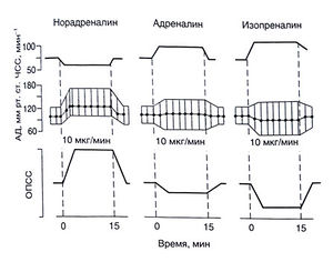 Фармакологические свойства. Сердечно-сосудистая система. Как уже говорилось, применяемый в клинике добутамин — это рацемическая смесь, и поэтому его влияния на сердечно-сосудистую систему складываются из эффектов обоих изомеров. В отличие от изопреналина, добутамин обладает более выраженным инотропным, чем хронотропным действием. Причина этого не известна. Возможно, дело в том, что ОПСС под действием добутамина не изменяется; не исключено также, что в инотропном эффекте добутамина участвуют α1-адренорецепторы. В дозах, оказывающих одинаковый инотропный эффект, добутамин меньше влияет на частоту разрядов синусового узла, чем изопреналин. На АВ- и внугрижелудочковое проведение оба препарата действуют одинаково.