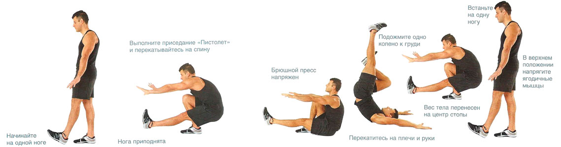 Бурпи задом наперед на одной ноге, или приседание «Пистолет» с перекатом[править | править код]