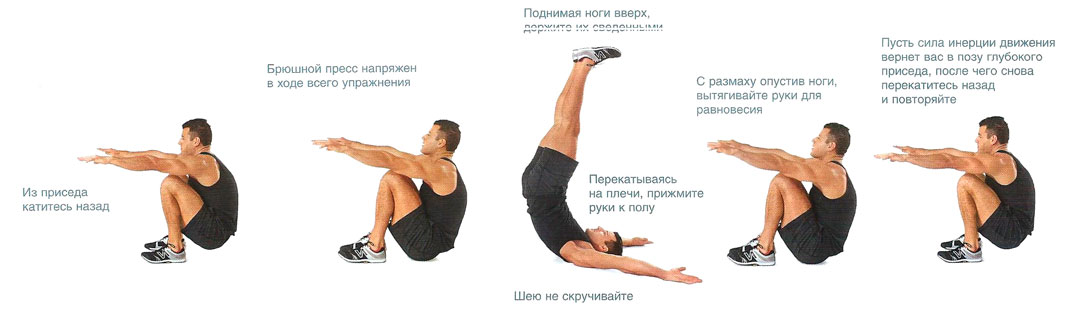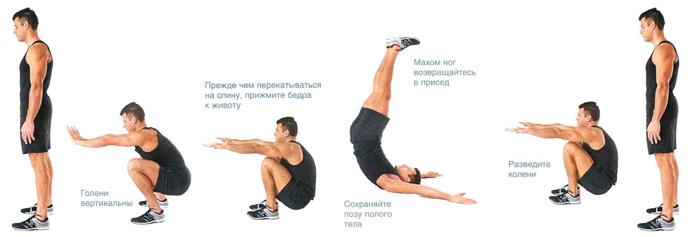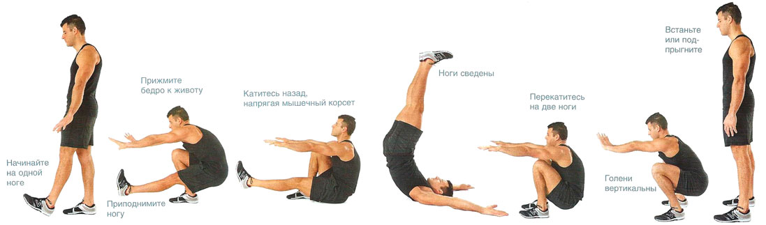 Ниже представлена последовательность различных уровней сложности этого упражнения, начиная с «полного ноля» и заканчивая «супергероем». Вы научитесь безопасно перекатываться на спине, переходить в присед, вставать. Постепенно вы приобретете необходимую силу, устойчивость, чувство равновесия и гибкость, чтобы выполнять бурпи задом наперед на одной ноге. Более того, приседания с перекатом и приседания «Пистолет» с перекатом послужат хорошей подготовкой к выполнению глубоких приседаний и приседаний «Пистолет». Дополнительный импульс, который вы приобретаете, размахивая руками и ногами, помогает вставать из глубокого приседа, особенно на одной ноге. Поэтому, перекатываясь назад, как можно сильнее тяните руки вперед. Туловище в данном случае наклоняется вперед, и это нормально, но спина должна оставаться прямой. Кроме того, в момент перехода в позу глубокого приседа стопы должны находиться точно под тазобедренными суставами, иначе вас поведет назад. Любые варианты приседаний с перекатом можно дополнить прыжками.