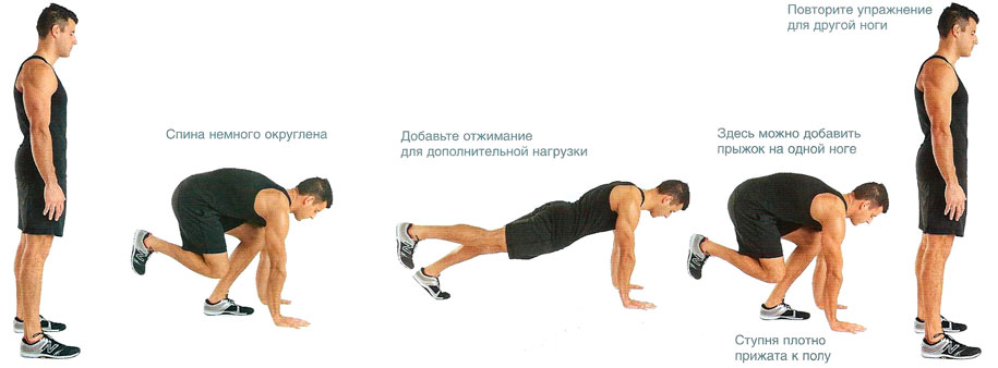 - бурпи на одной ноге и бурпи задом наперед на одной ноге;