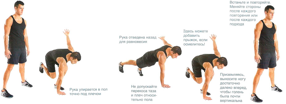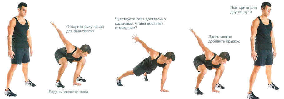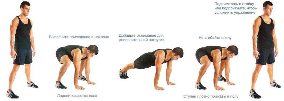 Это упражнение на самом деле представляет собой целую серию движений, плавно переходящих одно в другое, начиная с полной стойки и заканчивая отжиманиями, а потом обратно. Данный комплекс сочетает в себе наклон вперед, приседание, планку, отжимание и прыжки, и все это интегрируется в одно целое. Никакое другое упражнение не задействует столько мышц и не сжигает столько калорий в единицу времени. Идеальное выполнение этого упражнения — знак принадлежности к элите фитнеса и показатель высочайшей физической подготовки. Я же говорил, что это круто!