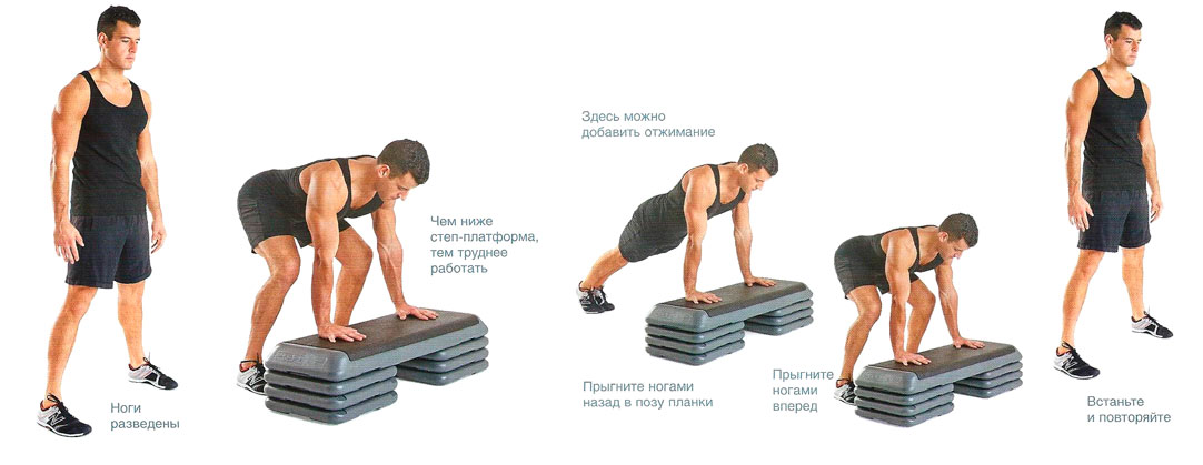 - ПРЫГНИТЕ НОГАМИ НАЗАД В ПОЗУ ПЛАНКИ. Приняв позу планки (упор лежа), вы можете в зависимости от уровня подготовки либо удерживать ее, либо выполнить полноценное отжимание, держа предплечья строго перпендикулярно полу. Использование степ-платформы позволяет выполнить облегченную версию отжимания на приподнятых руках.