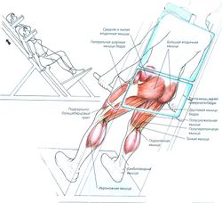 Нагрузка в тренажёрах, в которых движение выполняется не вертикально, а под углом к основанию, в частности - в гакк-приседаниях, равна произведению синуса угла между основанием и направляющими на вес снаряда, в случае гакк-приседаний - на вес платформы.