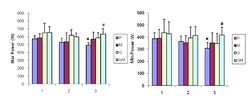 В данном исследовании приняли участие 28 физически подготовленных студентов-мужчин. Они были рандомизированы на 4 группы на основании показателей максимальной мощности (Max Рower) и принимаемого раствора за 2 часа до исследования: 1) G-группа (пероральный прием дипептида Глутамина в дозе 0,25 г/кг массы тела в 250 мл воды), 2) M-группа (50 г мальтодекстрина в 250 мл воды), 3) GM-группа (50 г мальтодекстрина + дипептид Глутамин в дозе 0,25 г/кг массы тела в 250 мл воды; 4) P-группа (плацебо, 250 мл воды с 30 г подсластителя). Каждый участник проходил трехразовый беговой анаэробный спринт-тест (Running-based Anaerobic Sprint Test (RAST) с интервалом 1 час. При этом регистрировались: максимальная мощность (Max power), минимальная мощность (Min power) и утомляемость. Основные результаты (рис.8): 1) отсутствие изменений в плацебо-группе по сравнению с исходными показателями во всех трех сериях упражнений с тенденцией к снижению результатов от серии к серии; 2) тенденция к поддержанию обоих видов мощности в группах с мальтодекстрином и дипептидом Глутамина; 3) достоверное сохранение обеих видов мощности в группе с совместным использованием мальтодекстрина и дипептида Глутамина и превышение данного эффекта по сравнению с группами с раздельным использованием дипептида Глутамина и мальтодекстрина в третьей сессии упражнений (на рисунке столбики под номером 3) (Р<0,05). Авторы делают заключение, что однократный прием спортивного напитка, содержащего дипептид L-Глутамина и мальтодекстрин, за 2 часа до анаэробной физической нагрузки, является эффективным методом предотвращения падения анаэробной мощности при повторяющихся трехкратных упражнениях в течение относительно короткого интервала между ними.