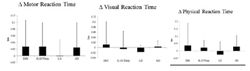 Оценка изменений показателей моторной и визуальной реакции, времени физической реакции проводилось до и после бега (рис.5). Наибольшие положительные изменения наблюдались в группе с низким содержанием АГ (LD), в которой отмечалось снижение времени визуальной и физической реакции, в наименьшей степени возрастало время моторной реакции. Как низкие, так и высокие дозы АГ, в отличие от других вариантов исследования, усиливают когнитивную функцию в постнагрузочный период, что подтверждается повышением частоты успешных результатов в специальном тесте (идентификация предлагаемых визуальных комбинаций цветных шаров на стене со сменой конфигураций (Cave Automatic Virtual Environment (CAVE) system (NeuroTracker, CogniSens, Montreal, Quebec), а также успешностью решения простых математических компьютерных цифровых заданий (Serial Sevens Test –А.Smith, 1967). Автор делает заключение, что АГ в низких и высоких дозах в составе электролитного спортивного напитка, оказывает позитивное влияние на физическую готовность спортсменов к длительным изнуряющим упражнениям, снижает потерю веса (регидратирует), сохраняет высокую моторную и визуальную реакцию и когнитивную функцию. Это связано, в первую очередь, с усилением всасывания воды и электролитов под влиянием АГ, а также, возможно, с нормализующим влиянием АГ и L-Глутамина на ЦНС.