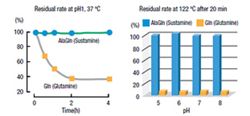 Как видно из левого графика, при температуре тела 50% L-Глутамина разрушается уже в течение 1-го часа, в то время как АГ (AlaGln) сохраняется стабильным, по крайней мере, в течение 4-х часов, что достаточно для полного всасывания в кишечнике. АГ проявляет также повышенную термоустойчивость (правый график), что имеет значение в производственных процессах и при хранении.