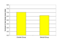 На сегодняшний день нет весомых доказательств, что хроническое (длительное, в течение 6 недель) L-Глутамина увеличивает ТМТ и мышечную силу (D.Candow и соавт., 2001; J.Antonio и соавт., 2002). Это связывают с недостаточной биодоступностью аминокислоты в чистом виде для клеток скелетных мышц и ее первичном использовании энтероцитами кишечника. В то же время, практически отсутствуют исследования хронического введения дипептидов L-Глутамина у спортсменов, особенно в сочетании с белковыми нутриентами и макронутриентными смесями. Определенную надежду в этом плане дают данные S.Bynum (2000), где автор сравнил влияние перорального однократного ежедневного приема 400 мг хелатного магниевого соединения Глицил-L-Глутамина (MgГГ, хелатная группа, n=11) и стероидного анаболика тестостерона в дозе 2000 мг (стероидная группа, n=12) в течение 56 дней на тощую массу тела (ТМТ) и ряд биохимических показателей крови здоровых добровольцев в условиях ежедневных тренировок определенной постоянной интенсивности и продолжительности. Полученные результаты представлены на рис.9.