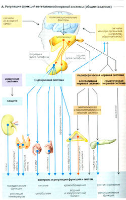 Гормоны работают в близком взаимодействии с нервной системой и регулируют пищеварение, метаболизм, рост, созревание, физическое и умственное развитие, репродуктивную функцию и адаптацию к условиям, а также постоянство внутренней среды организма (гомеостаз) (А). Большинство этих функций выполняет в основном ВНС, но она подлежит центральному управлению при помощи гипоталамуса, который, в свою очередь, контролируется высшими нервными центрами мозга.