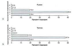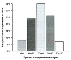 Проведение тестов на повторный максимум каждые три-четыре недели по окончании макроцикла обычно оказывается достаточным для того, чтобы выявить результаты использования диапазона интенсивности от 90 до 100 процентов. На протяжении многих лет западными авторами работ, в которых рассматривались силовые тренировки, поддерживалось использование работы до концентрического отказа (без резерва) в качестве необходимого условия повышения уровня силы. В действительности, как следует из информации, представленной в статье: Нервно-мышечная реакция на силовые тренировки, все нервно-мышечные адаптации, способствующие повышению результативности спортсмена (за исключением максимального гипертрофического эффекта[3], не требуют работы до концентрического отказа. Данная точка зрения также поддерживается подходом к применяемой во время силовой тренировки нагрузке и распределению повторений со стороны высококлассных тяжелоатлетов; по большей части интенсивность их тренировок составляет 70-90 процентов, при этом количество повторений невелико, а работа до концентрического отказа никогда не проводится (см. рисунки 1 и 2 и таблицы 1 и 2).