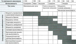 Нагрузка должна соотноситься с развиваемым типом силы и, что еще важнее, со специфической комбинацией, получаемой в результате смешивания силы и скорости или силы и выносливости. Общие рекомендации по использованию нагрузки при развитии каждой из данных комбинаций приведены в таблице 4. На различных этапах тренировки нагрузка изменяется под влиянием периодизации в соответствии с целями, определяемыми для каждого этапа тренировки. Как показано в таблице, нагрузка варьируется от 30 до более чем 100 процентов повторного максимума, а соответствующие уровни интенсивности показаны во второй строке таблицы. Ниже даны специфические комбинации и нагрузка, предлагаемая для каждой такой комбинации.