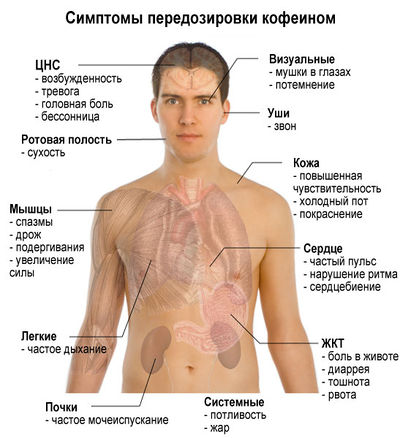 Побочные и общие эффекты кофеина наглядно проиллюстрированы на рисунке. Беременные и кормящие матери должны избегать приём кофеин-содержащих спортивных добавок.[15]. Люди в возрасте старше 50 должны с особой осторожностью принимать спортивное питание с кофеином. [16] При возникновении серьёзных побочных эффектов прекратите приём продукта.