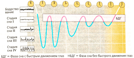 Сон представляет собой состояние покоя с многократно повторяющимися фазами активности головного мозга, которые можно зарегистрировать на электроэнцефалограмме (ЭЭГ). Стадии сна повторяются циклами по 4-5 раз за ночь, причем циклы прерываются фазой быстрого сна (ФБС или REM, от англ. Rapid Eye Movement) (А). ЭЭГ ФБС схожа с ЭЭГ бодрствования. ФБС характеризуется быстрыми движениями глазных яблок, наличием сновидений и подергиванием некоторых мышц, в то время как остальная мускулатура атонич-на. В норме ФБС предшествует фаза медленного сна (ФМС или NREM, от англ. No Rapid Eye Movement). При частом прерывании сна укорачивается время ФБС (в норме оно составляет около 25% всего времени сна), что приводит к состоянию беспокойства и раздражительности днем. Дефицит ФБС устраняется в последующие ночи за счет удлинения этой фазы (Б).
