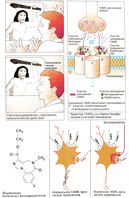 Для функционирования ЦНС необходимы механизмы активирования и блокирования нейронов. Процессы ингибирования нейронов головного и спинного мозга связаны главным образом с действием вещества-переносчика — у-аминомасляной кислоты (ГАМК), которая через ГАМК-рецепторы вызывает уменьшение возбудимости нервных клеток. Механизм запускается при связывании ГАМК, благодаря чему открываются С1~-каналы, что приводит к гиперполяризации клеточной мембраны и, следовательно, снижению возбудимости нейрона. Рецептор, построенный из пяти субъединиц, проявляет высокую специфичность к бензодиазепинам, связывание которых происходит на субъединице, расположенной рядом с той, где связана ГАМК. В результате аллостерического действия бензодиазепинов усиливается связывание и действие ГАМК. Из бензодиазепинов наиболее часто назначается диазепам. Барбитураты также способны связываться на белках Ch-каналов, в результате чего открывшиеся под действием ГАМК каналы более длительное время находятся в таком состоянии.