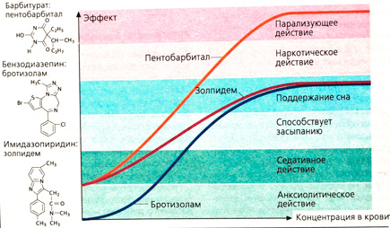 В зависимости от концентрации в крови бензодиазепины и бурбитураты оказывают успокаивающее и седативное действие, при приеме в более высоких дозах вызывают сонливость и способствуют засыпанию (В). В низких концентрациях бензодиазепины уменьшают чувство страха.