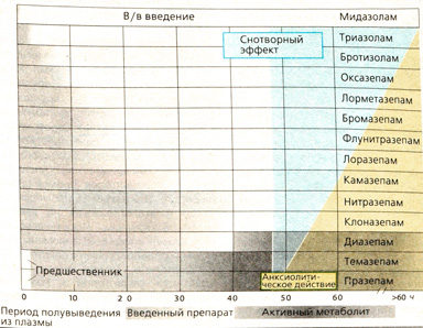 Бензодиазепины имеют широкий спектр активности: они оказывают успокоительное, усыпляющее, противосудорожное действие, уменьшают страх, понижают тонус скелетных мышц и могут быть использованы при наркозе. Особенно важно, что при применении терапевтических доз бензодиазепинов вегетативные центры (дыхательный центр и центр регуляции кровяного давления) не затрагиваются. Поэтому бензодиазепины имеют широкий терапевтический диапазон, их практически невозможно использовать при суицидальных наклонностях (в противоположность барбитуратам). В низких дозах бензодиазепины снижают возбуждение и действуют анксиолитически, не вызывая никаких осложнений! Бензодиазепины находят широкое применение как снотворные средства. Для этой цели предпочтительнее использовать соединения, которые в течение ночи (пока человек спит) могут полностью выводиться из организма (тетрациклические препараты, такие как триазолам, бротизолам, альпразолам). Для длительной седативной терапии необходимы препараты с более длинным периодом выведения, для которых гарантирована постоянная концентрация в организме (например, диазепам).