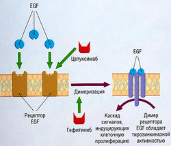 Рис. 7.19 Цетуксимаб, препарат моноклональных антител, ингибирует связывание EGF с его рецептором. Гефитиниб ингибирует активность активированного рецептора ECF, блокируя его способность к димеризации и тирозинкиназную функцию. EGF — эпидермальный фактор роста.