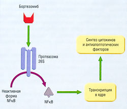 Рис. 7.20 Бортезомиб ингибирует активность протеасомы 26S в злокачественной клетке. Этот белок обладает ферментативными свойствами и способен активировать NFkB. NFkB — это фактор транскрипции, который может индуцировать синтез цитокинов (некоторые из них стимулируют синтез предшественника NFkB) и антиапоптотических факторов, способствующих неограниченному росту клеток злокачественной опухоли.