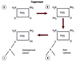 МЕХАНИЗМ ДЕЙСТВИЯ. Цисплатин связывается с гуанином в ДНК и РНК, и это взаимодействие стабилизируют водородные связи. На молекулярном уровне происходит раскручивание и укорочение спирали ДНК. Хотя возникают ISC (10% всех аддуктов), клеточный механизм действия — клеточная инактивация — обусловлен преимущественно образованием внутрицепочечных связей (75-80%). Существует соотношение между числом перекрестных связей, способностью репарировать перекрестное связывание и цитотоксичностью.