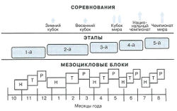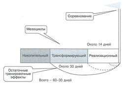 - отдельные мезоцикловые блоки объединяются в тренировочный этап; их правильная последовательность благотворно влияет на соревновательный результат, т.е. выступление в пике сезона.