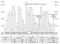 Оригинальный график, составленный Геннадием Турецким и Александром Поповым (рис. 2), представляет годичную схему недельных тренировочных нагрузок (т.е. объёмы плавания за неделю) и спортивные результаты в течение всего сезона. График демонстрирует чёткое разделение каждого сезона на шесть этапов, в которых объём тренировок рос, стабилизировался почти на максимальном уровне и снижался перед соревнованием на заключительном этапе. Тенденция изменения нагрузки полностью соответствует логике очерёдности специализированных мезоцикловых блоков, т.е. объёмного мезоцикла для базовых способностей, интенсивного для специфических по виду спорта способностей и сужения.