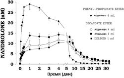 Метаболиты нандролона выводятся из организма в течение длительного времени. 16-18 месяцев - сроки обнаружения фенилпропионата, и 18-24 месяца - деканоата. Поэтому препараты нандролона не рекомендуются к приему соревнующимися спортсменам.