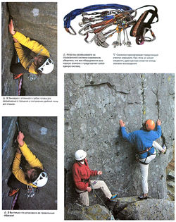 Полезно располагать снаряжение на поясе в определенной, постоянной последовательности, которая становится для вас привычной. Это тоже сэкономит время и силы. Оттяжки, любое страховочное снаряжение и веревочные петли, френды должны быть продуманно размещены и доступны на ощупь во время восхождения. Многие страховочные средства имеют цветовую кодировку, принятую производителем, — долгими зимними вечерами можно изучить эти системы кодировки ради будущего собственного удобства. Ни один отдельно взятый метод не решит всех проблем, если вы не будете экспериментировать с ним, адаптировать его к условиям. Вы наверняка обнаружите, что в реальности вам нужны совершенно определенные средства страховки. Держите их под рукой.