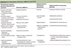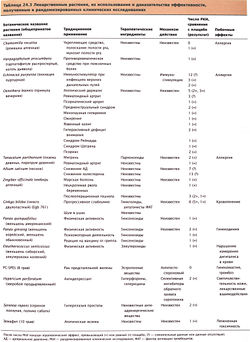 В табл. 24.3 приведены некоторые распространенные растительные препараты и их традиционные показания к применению. В таблицу включены современные доказательства эффективности и некоторые известные побочные эффекты. В настоящее время окончательных доказательств эффективности растительных препаратов, основанных на данных клинических наблюдений, нет. Проводились исследования, в ходе которых было показано некоторое превосходство над плацебо, но эти результаты требуют подтверждения в более обширных и долговременных наблюдениях. Доступных данных о безопасности длительного использования растительных препаратов также очень мало.