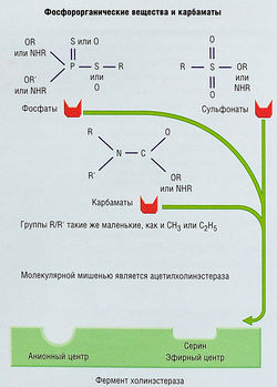 Рис. 24.12 Токсичные фосфорорганические инсектициды. Эти фосфорорганические соединения и карбаматы являются ингибиторами холинэстеразы с химическими структурами, основанными на фосфорных, сульфонатных или карбонатных группах, воздействущими на эстерические места связывания холинэстераз-ных ферментов. На рынке представлено более ВБ фосфатных и 20 карбаматных антихолинэстеразных соединений.