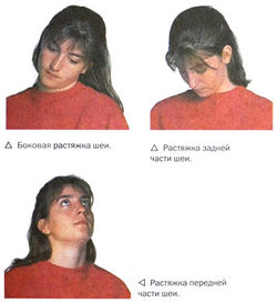 Встаньте или сядьте прямо, затем медленно наклоните голову к одному плечу, верните ее в центральное положение, затем наклоните к другому плечу, затем вперед и назад, каждый раз возвращаясь на мгновение в центральное, прямое положение после каждого наклона головы. Не вращайте шеей.