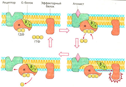 G-белки, участвующие в трансмембранном переносе сигнала, регулируются общими механизмами. На рисунке представлен их цикл активации и инактивации. В базальном состоянии три субъединицы G-белков связаны вместе и с гуанозиндифосфатом (ГДФ), присоединенным к α-субъединице. Когда агонист соединяется с рецептором, ГДФ отделяется, и освободившееся на α-субъединице место занимается гуанозинтрифосфатом (ГТФ), в избытке присутствующем в цитоплазме.