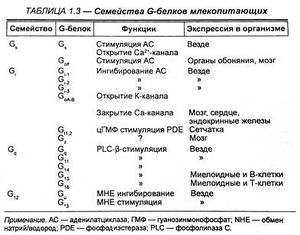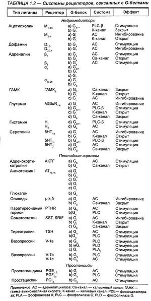 В таблице приведены примеры подобных рецепторных систем. Очевидно, что большое количество первичных мессенджеров регулируют лишь несколько вторичных. Таким образом, следует понимать, что специфичность действия первично связывающихся лигандов определяется локализацией рецептора на определенных клетках, в которых вторичные мессенджеры вызывают экспрессию белков, специфичных для данной клетки.