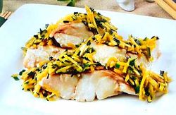 Добавить яичный желток, разведенный в небольшом количестве воды. Подождать, пока соус загустеет. Приправить солью и перцем, добавить порошок карри и шафран. Выложить филе сайды в горячее блюдо и полить соусом. Посыпать зеленью петрушки.