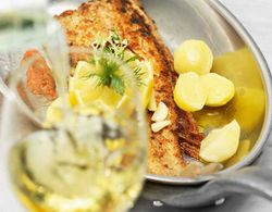 Извлечь мидии и отлить из сковородки 100 мл сока, который образовался во время варки. Положить филе путассу в скороварку и тушить 10 минут на слабом огне в соке мидий с лавровым листком, чабрецом и чесноком.