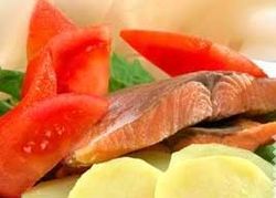 Филе горбуши нарежьте порционными кусками, отварите в подсоленной воде с добавлением лимонного сока, охладите. Помидор нарежьте дольками, картофель — кружочками, цветную капусту разберите на соцветия.