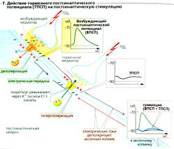 3. Дальнейшие постсинаптические процессы. Если ВПСП превышает критический уровень, то в ближайших к постсинаптической мембране участках возбудимой мембраны открываются потенциалзависимые каналы и возникает распространяющийся потенциал действия. Так происходит в посгсинаптических нейронах и скелетных мышцах. В некоторых гладких мышцах, где распространяются даже низкоамплитудные потенциалы, ВПСП может увеличивать частоту спонтанных потенциалов действия и тем самым повышать мышечный тонус. В железах ВПСП запускает секрецию за счет повышения концентрации Са2+ в цитоплазме. ТПСП, препятствующий эффектам ВПСП, возникает в нейронах и в гладких мышцах, но не в скелетных мышцах. Конечная реакция эффекторной клетки (например, возникновение потенциала действия) зависит от результатов суммации всех постсинаптических потенциалов.