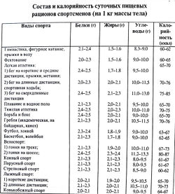 Наиболее благоприятное соотношение основных пищевых веществ (белков, жиров и углеводов) для взрослых составляет 1:1:4 — это так называемая формула сбалансированного питания. Для спортсменов эта формула выглядит иначе: 1:0,8:4 или даже 1:0,7:4. Это связано с тем, что при выполнении спортивных упражнений нередко возникает кислородный голод. На окисление жиров требуется больше кислорода, чем на окисление углеводов; в условиях нехватки кислорода при использовании жира в качестве источника энергии образуются недоокисленные продукты — кетоны, являющиеся ядовитыми для организма.