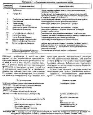 Одновременно с тромбоцитарными активируются и плазменные факторы (табл. 2.21), обеспечивающие каскад последовательных ферментативных реакций (рис. 2.14), конечным результатом которого является образование кровяного сгустка.