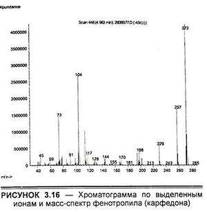 Фенотропил (карфедон) — ноотропный препарат, имеющий некоторое структурное сходство с фенамином, и проявляющий в силу этого при применении в высоких дозах психостимулирующий эффект. Вместе с тем при применении в терапевтических дозах подобного действия практически не наблюдается. На рисунке представлены хроматограмма по выделенным ионам и масс-спектр фенотропила.