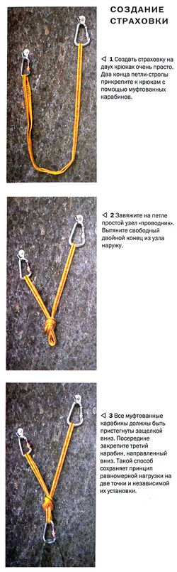 - 1 Создать страховку на двух крюках очень просто. Два конца петли-стропы прикрепите к крюкам с помощью муфтованных карабинов.