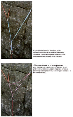 - Это альтернативный метод создания страховочной станции на нескольких точках страховки. Узел "Проводник- используется для организации центральной петли станции.