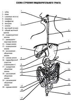 Итак, взглянем на схему строения пищеварительной системы. Мы откусили кусочек чего-нибудь съестного. Откусили зубами (1) и ими же продолжаем пережевывать. Даже чисто физическое измельчение играет огромную роль - пища должна поступать в желудок в виде кашицы, кусками она переваривается в десятки раз хуже. При жевании происходит также пропитывание слюной, выделяемой 3 парами больших слюнных желез (3) и множеством мелких.