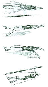 1. Стартуйте от стенки бассейна. Оттолкнитесь, приняв обтекаемое положение; контролируйте глубину погружения тела.