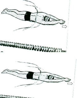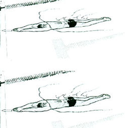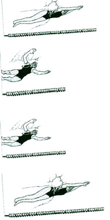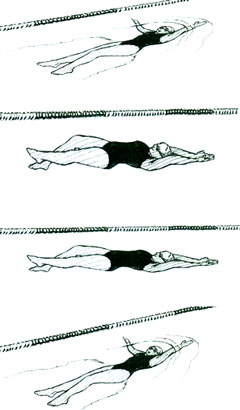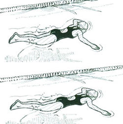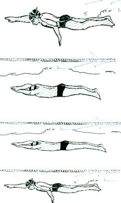 1. Оттолкнитесь от стенки бассейна под водой (тело погружается примерно на 60 сантиметров), лягте на спину, сложите руки в обтекаемое положение. Оттолкнувшись от стенки, начните работать ногами (порхающая работа ног).
