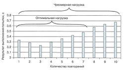Пример. Команда опытных футболистов выполняла обычные упражнения для совершенствования максимальной скорости: дриблинг десять раз по 20 м с пятью касаниями мяча на максимальной скорости и с 1,5-минутными интервалами отдыха. Лучшей была третья попытка; близкий к этому уровню результат поддерживался до 7-го повторения (рис. 2). Другие попытки были хуже более чем на 0,4 с (10-процентное отклонение). Это означает, что запланированная для команды нагрузка была чрезмерной. Исходя из результатов выполнения упражнения, индивидуальная дозировка должна была варьировать между шестью и восьмью повторениями (Mark Tunis, 2005, личное сообщение автору).