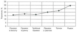 Особенности тренируемости, связанные с принадлежностью к полу, были рассмотрены по отношению к максимальным спортивным результатам, их физиологическим предпосылкам, физическим качествам и кумулятивным эффектам систематического тренировочного процесса. Максимальные ГР были отмечены в спортивных дисциплинах, требующих проявления максимальной силы (22,6-30%), взрывной силы (15,9-17,4%) и комбинированного проявления максимальной аэробной способности и анаэробной гликолитической мощности (11,6-13,2%). Минимальные ГР характерны для видов, требующих максимальной скорости (7,1%), и дисциплин, в которых проявляется аэробная выносливость к длительной работе (8,1-5,1%).