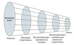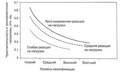 Также считается, что тренируемость меняется с ростом спортивного мастерства. Общей тенденцией является её снижение. Другими словами, более квалифицированные и опытные спортсмены менее чувствительны к тренировочному воздействию, чем их более молодые и менее квалифицированные коллеги. Здесь возникают два практических следствия: количество эффективных упражнений уменьшается с ростом квалификации спортсмена (эффект воронки); уровень специфической по виду спорта адекватности при выполнении развивающих упражнений должен увеличиваться с ростом спортивного мастерства. В зависимости от скорости индивидуального совершенствования специфических по виду спорта способностей спортсмены могут быть подразделены на группы с выраженной, средней и слабой реакцией. Очевидно, что спортсмены первой группы - это люди с экстраординарной тренируемостью, и этот отличительный признак чрезвычайно важен для выявления спортивных талантов.