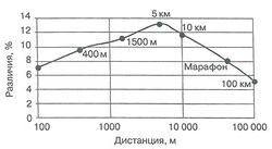 Биомеханические и антропометрические факторы, значительно влияющие на ГР, были тщательно проанализированы исследователями (обзор Cheuvront et al., 2005). Однако, сосредотачиваясь на главных физиологических детерминантах, мы можем отметить, что минимальные ГР наблюдаются в дисциплинах, где преимущества мужчин меньше (100 м) или где преимущества некоторых спортсменок частично компенсируют другие отставания (100 км). Наиболее значительные ГР отмечены в результатах бега на дистанции 5 км, где основные метаболические факторы, то есть аэробная мощность и гликолитическая анаэробная ёмкость, обеспечивают мужчинам-спортсменам такое впечатляющее превосходство.