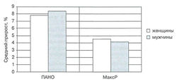Пример. 9 женщин и 14 мужчин, элитные гребцы на байдарках в возрасте 19-29 лет, обследовались в течение трёх месяцев на раннем этапе подготовки. Программа тренировки была главным образом посвящена развитию аэробных и специфических по виду спорта силовых способностей. Еженедельная программа состояла из девяти-десяти тренировок (общие затраты времени составили приблизительно 24-27 ч в неделю). Кумулятивный тренировочный эффект оценивался ступенчато возрастающим тестом 4x500 м с измерением лактата крови и средней скорости при каждом прохождении дистанции, также измерялись лактатный порог анаэробного обмена (ПАНО) и наилучший результат (МаксР). Как байдарочники, так и байдарочницы значительно улучшили свои аэробные возможности, т.е. скорость ПАНО увеличилась на 8,4 и 7,8%, а МаксР - на 4,5 и 4,1% соответственно (Рис. 7). Таким образом, не были отмечены какие-либо специфические эффекты, обусловленные принадлежностью к полу (Issurin, Lustig, 2006).
